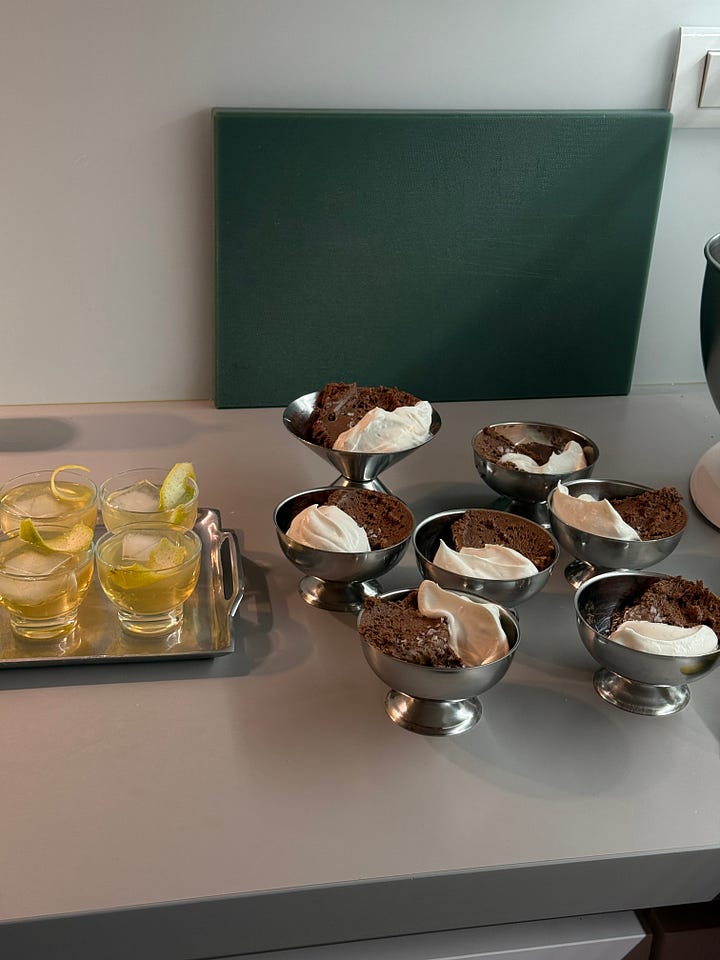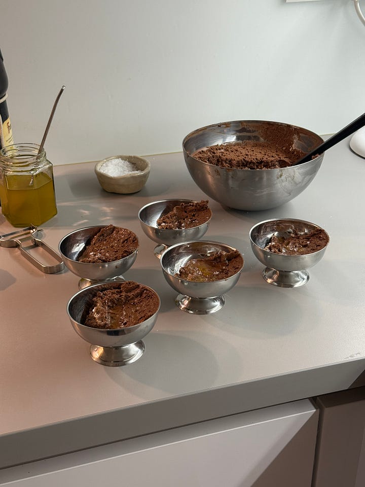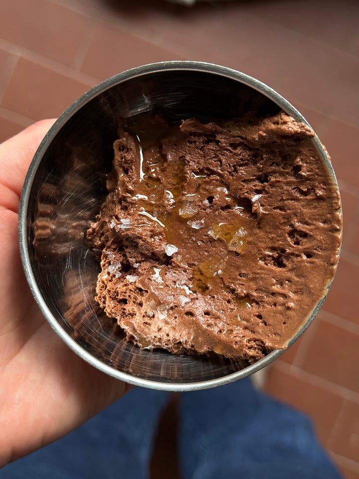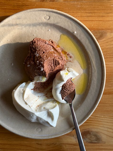 I’m talking about chocolate mousse, which is, in my opinion, a perfectly light and decadent way to finish up a meal. A small dollop of mousse, paired with lightly whipped cream, drizzled with olive oil, and topped with a sprinkle of flaky sea salt, is honestly the only thing I have space for in my stomach after eating and drinking for hours. I like to serve it with a tiny glass of digestivo (hazelnut liqueur pairs especially well). How adult.
