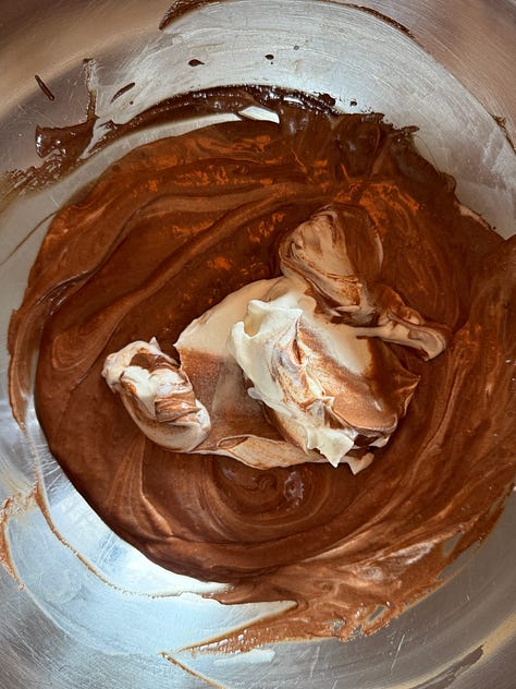 Remove the bowl containing melted chocolate from the heat, and slowly fold in whipped aquafaba. I like to do it in 4 to 5 steps, making sure the previous batch of aquafaba is properly folded in before adding the next one. Try to be gentle to incorporate as much air as possible.